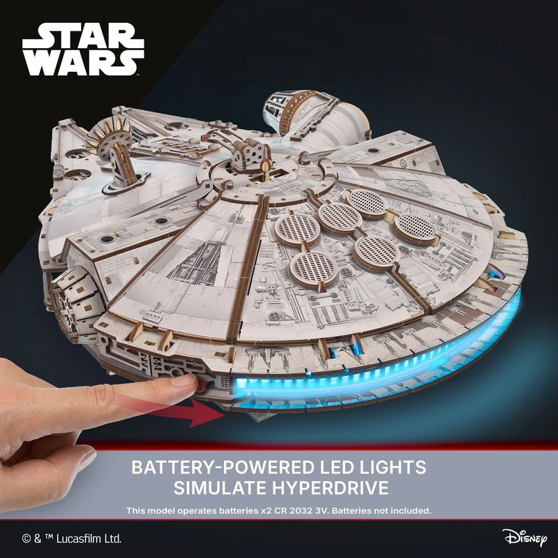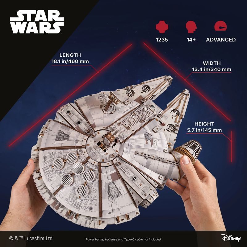 Létejte na nejrychlejší lodi v galaxii! Postavte si vesmírnou loď Star Wars™ Millennium Falcon™ z licencované kolekce Star Wars™ od Ugears. V měřítku 1:75 je tento úžasný model lodi, na které létají sympatičtí pašeráci Han Solo a Chewbacca, největším a nejdetailnějším modelem, jaký kdy společnost Ugears vydala. Millennium Falcon™, klíčová stíhačka nejzásadnějších bitev proti Galaktickému impériu, prošla rukama řady zločinců, až ji nakonec ukradli a pilotovala Rey Skywalkerová ve filmu Síla se probouzí (2015), než ji Han a Chewie získali zpět. Millennium Falcon™ má vysoce detailní, barevné prvky na exteriéru a v interiéru, které kopírují vzhled lodi ve filmech Star Wars™, a také modrá LED světla napájená bateriemi, která simulují záři hyperpohonu. Pohyblivé prvky zahrnují nástupní rampu, dveře nákladového prostoru, podvozek, střelecké věže, otočnou anténu o 360° a zatahovací střechu, která se otevírá a zobrazuje úžasný detailní realismus interiéru lodi. Prvky z dřevovláknitých desek s vysokou hustotou a lepenky přinášejí větší odolnost. Postavte si a vlastněte kus filmové historie s tímto naprosto výstavním 3D modelem lodi Millennium Falcon™.
