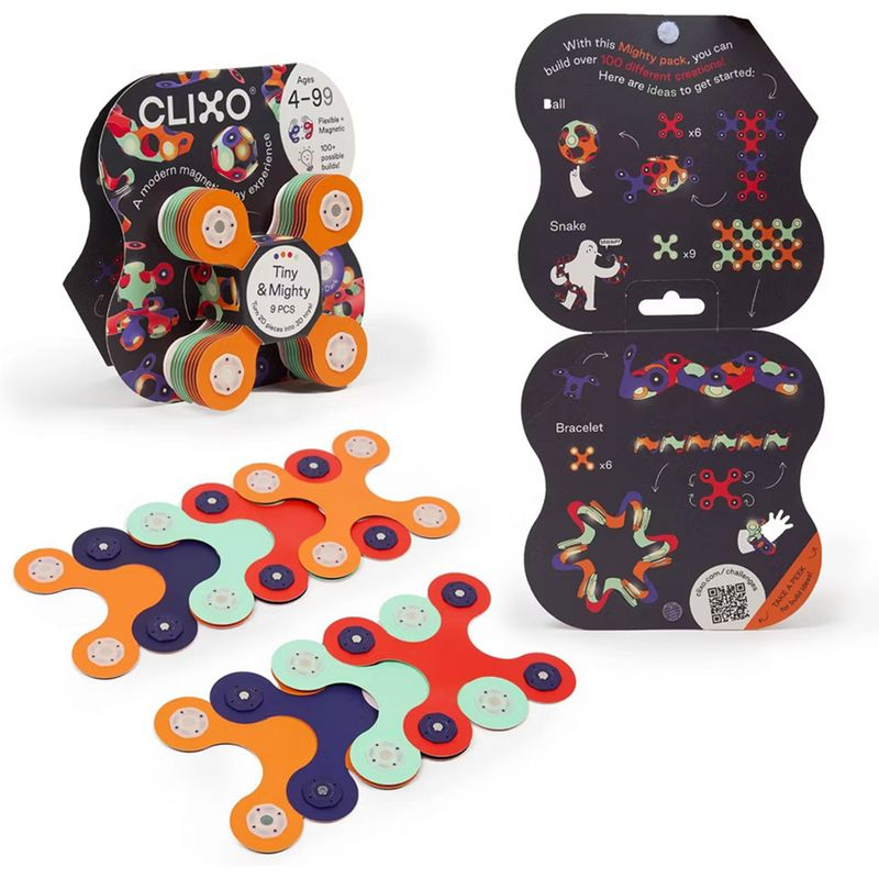 CLIXO je flexibilní, velmi lehká, zcela inovativní magnetická stavebnice ze syntetického papíru, vyráběná v různých barevných kombinacích, která je inspirována origami. Tato stavebnice je založena na principu spojování různých tvarů a dílků přichycením červených a modrých magnetů, které jsou zabudovanými v důmyslném pouzdře, jež umožňuje rotační pohyb o 360° a zároveň fixuje ve 24 polohách. Stavebnice je navržena tak, aby rozvíjela dětskou kreativitu, prostorové vnímání a jemné motorické dovednosti. Jednotlivé sady jsou vynikající pomůcky pro výuku STEAM (Science, Technology, Engineering, Arts, and Mathematics) a to jak doma, tak i ve třídě. Jedná se také o skvělou Montessori hračku. Nedají se ani roztrhnout, jen přestřihnout nůžkami. Každý díl je vyroben z patentovaného, recyklovatelného syntetického papíru (nevadí mu ani voda), magnetů a polymerů bezpečných pro děti, které neobsahují BPA, ftaláty a jsou netoxické. Díky recyklovatelným materiálům a odolné konstrukci jsou pro děti zcela bezpečné. Výrobky CLIXO jsou vyrobeny s důrazem na každý i ten nejmenší detail. Díky estetickému balení jsou jednotlivé CLIXO sady ideální i jako dárek. Velmi vhodné jsou také do mateřských škol a vzdělávacích zařízení při kreativních aktivitách s dětmi.