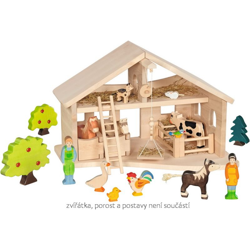 Větší dřevěný domeček je vyroben z javorového dřeva a není povrchově ošetřený, takže jeho nádherná kresba letokruhů zcela přirozeně vynikne. Navíc je pro děti velmi podnětné dotýkat se přírodního dřeva. A kdo bude uvnitř bydlet? Domeček se může stát stájí pro domácí zvířátka jako koně, kravičky ovečky ap. Domeček se dodává samostatně a zvířata lze dokoupt zvlášť. Vyrobeno v Evropě. Vhodné od 3 let.