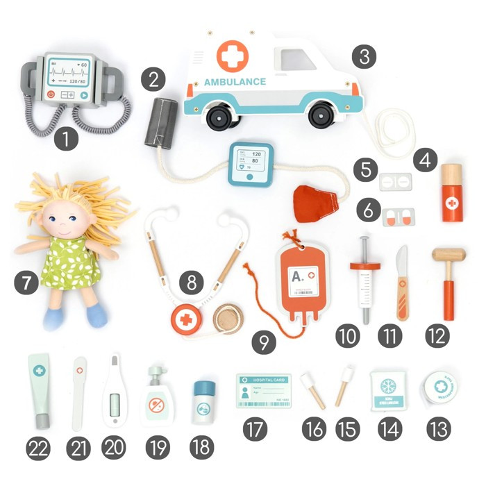 Součástí sady je - defibrilátor, sanitka, mast, kleště na jazyk, teploměr, mýdlo na ruce, lahvičku s léky, voděodolnou pásku, ledový obklad, vatové tampony, lékařský balíček, vatový tampon, průkaz pacienta, tlakoměr, figurína, stetoskop, krevní vak, injekční stříkačka, chirurgický nůž, kladívko, lékařský sprej, tablety, tablety.