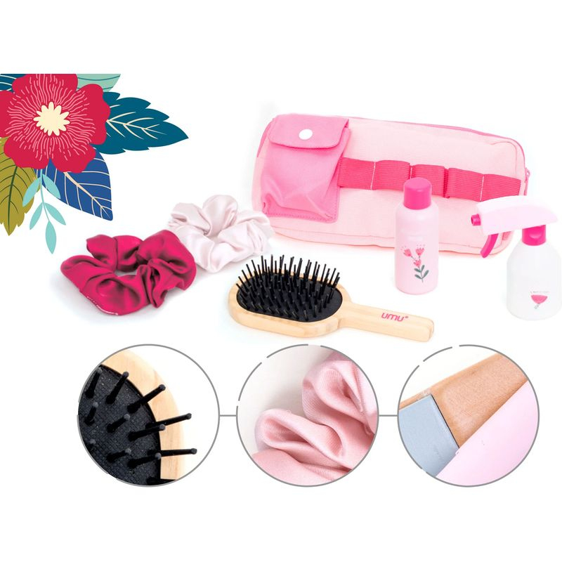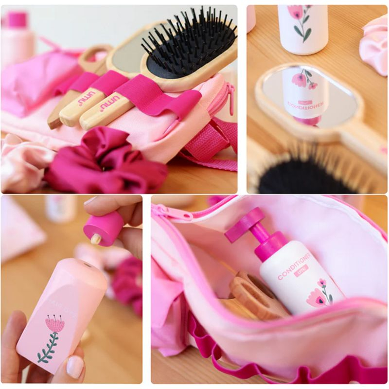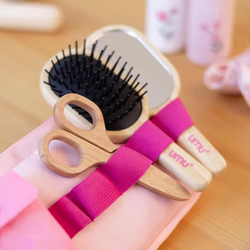 Dřevěné nářadí na opasku pro malé parádnice - kadeřnice. Hezké růžové provedení.