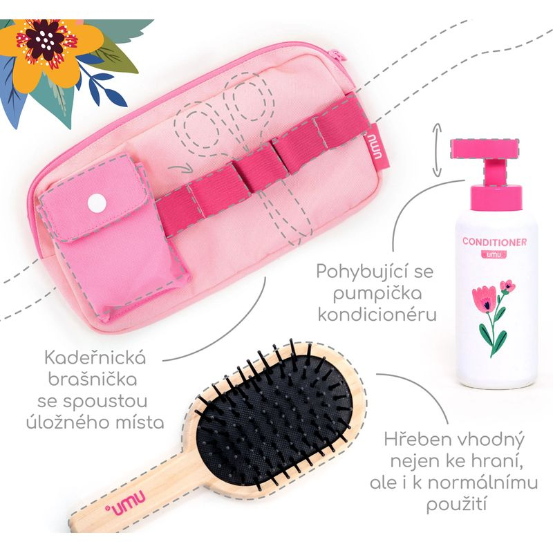 V této sadě najde malá parádnice vše co potřebuje pro svou hru na kadeřnici. Tato hračka pro holky rozvíjí dětskou kreativitu, představivost, myšlení, paměť, jazykové a motorické dovednosti. Hra na kadeřníky vede děti k ohleduplnosti. Při česání i foukání vlasů se učí být jemné, pozorné, “netahat” a starat se o druhé. Pocit, že jim někdo „svěří své vlasy do rukou“, posiluje jejich sebevědomí a díky naší pozitivní zpětné vazbě také radost z dobře odvedené práce.