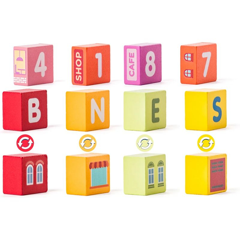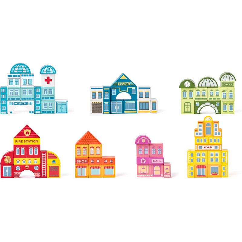 Dřevěná stavebnice ze dřeva, která obsahuje 115 dílků barevných kostek, a figurek. Sestavit lze nepřeberné množství staveb. Kostky mají na sobě vyobrazení oken a dveří, je zde požární a policejní stanice, nemocnice, školu, kavárnu i obchod. Nech ulicemi projíždět auta, vrtulník kroužit nad městem a plnit své úkoly. Podkladová deska z puzzle dílů dotvoří dokonalou scénu pro tvé příběhy!