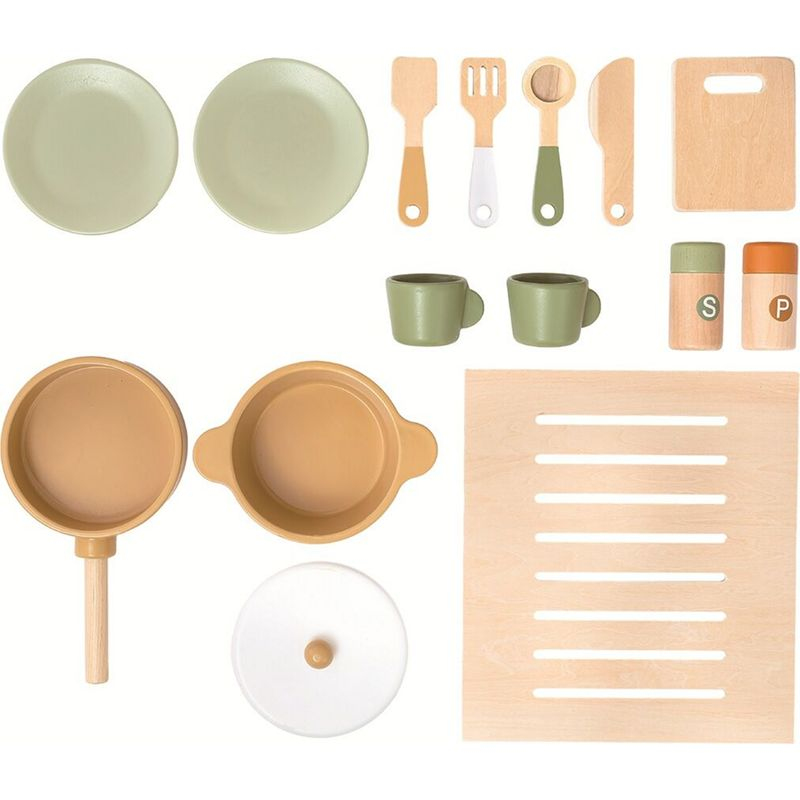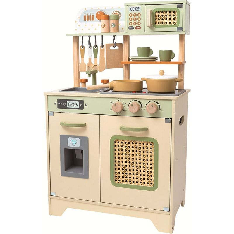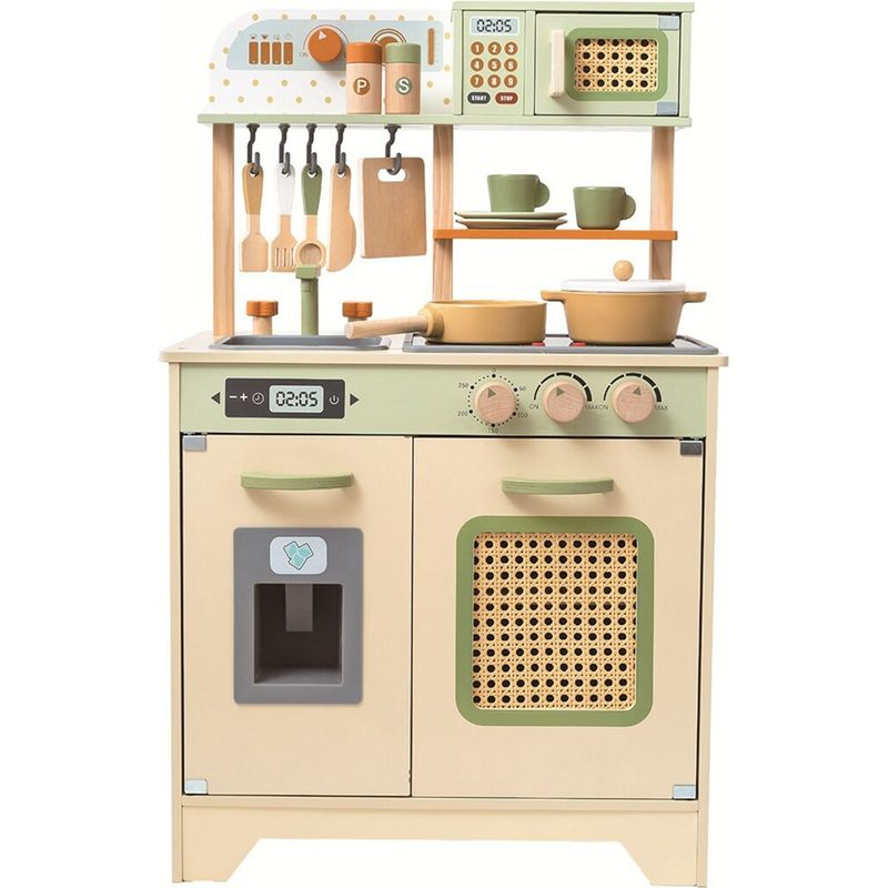Je libo teplý domácí koláček? Nebo snad máte chuť na něco smaženého? S touto kuchyňkou můžete mít menu dle Vašeho přání. Je totiž plně vybavená! Najdete zde vše, co v moderní kuchyni nesmí chybět - sporák s troubou, výrobník ledu, mikrovlnku, dřez, kávovar a samozřejmě nádobí s náčiním, jako jsou talíře, hrnec, pánev, hrnečky, nůž, naběračka a další. Díky otevíracím dvířkům a otočným knoflíkům je požitek ze hry ještě realističtější. Vše je vyrobeno z kvalitního pevného dřeva a ošetřeno netoxickými barvami. Tak si nasaďte kuchařskou čepici, oblečte zástěru a dejte se do vaření!