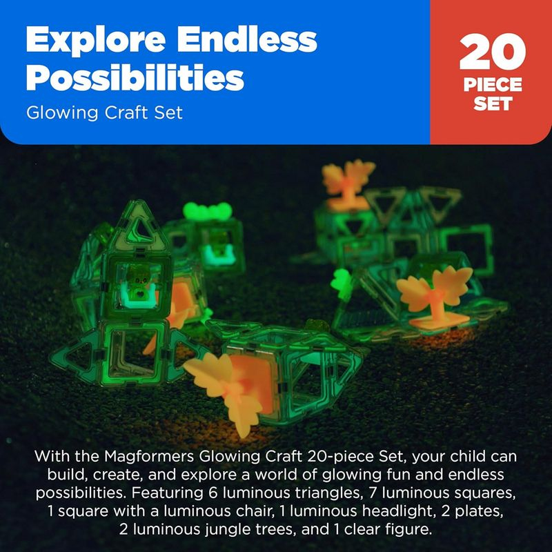 Tato sada obsahuje 20 magnetických dílků a vkládacích doplňků, které umožňují nekonečné možnosti stavění. Speciální Glow dílky jsou exkluzivní pouze pro tuto sadu, což ji činí ještě unikátnější. S Magformers Glowing sadou můžete postavit různé ve tmě svítící scenérie, květiny, domky a mnoho dalších tvarů a objektů.Vaše fantazie je jediným limitem!