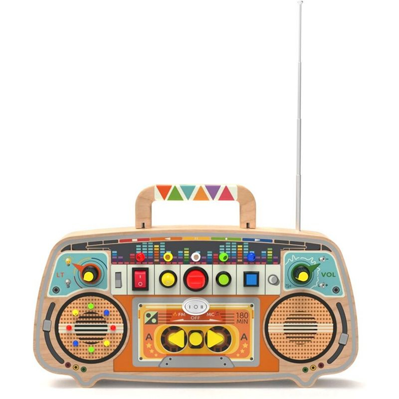 Tento originální dřevěný activity board ve stylu retro rádia okamžitě upoutá pozornost nejmenších dětí díky senzorickému LED panelu s barevnými světýlky a svítícími tlačítky. Chytře navržená kombinace interaktivních prvků, jako jsou otočné knoflíky, přepínače, posuvníky, stylizované reproduktory, podporuje rozvoj jemné motoriky, smyslového vnímání, kreativity a hudebního sluchu. A navíc si děti mohou naladit opravdové stanice a poslouchat hudbu či mluvené slovo! Také se zaposlouchají do nahraných příjemných melodií, díky nimž se seznámí s různými rytmy a hudebními styly. Praktické dřevěné madlo usnadňuje manipulaci a přenášení hračky.