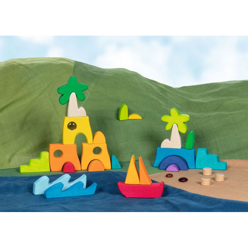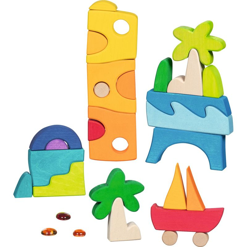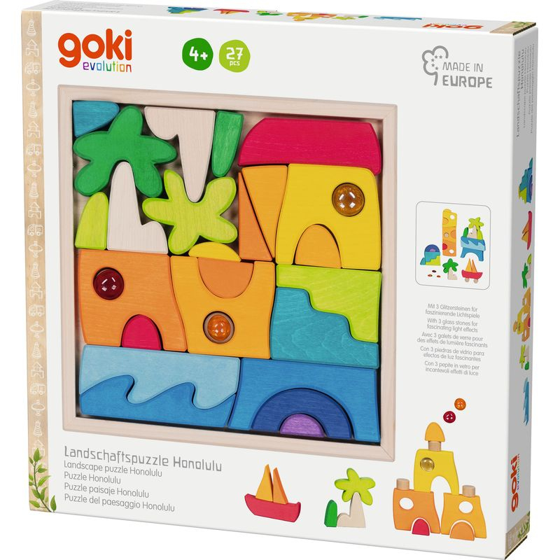 Dřevěná vzdělávací hračka - mozaika Honolulu. Duhově zářivé dřevěné puzzle s motivy z ostrova Havaj. Uvnitř dřevěného rámu najdou děti dílky ve tvaru domečků, vlnek nebo palem, celkem 27 dílů včetně tří třpytivých kamínků. Tyto kostky mohou děti skládat do plochy, ale mohou je využít také jako klasické stavební kostky. Velmi dobře se kombinují s ostatními kostkami z řady goki evolution. Jasné barvy, nepravidelné tvary a příjemný dřevěný povrch kostek podněcuje dětskou kreativitu a nabádá ke hře. Vyrobeno v Evropě. Vhodné od 3 let.