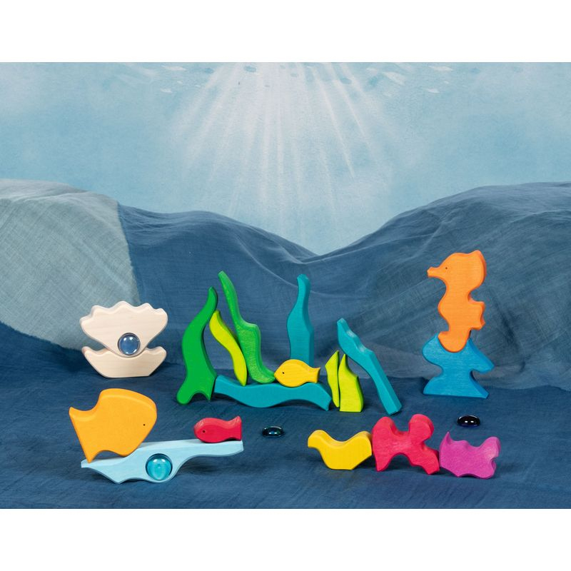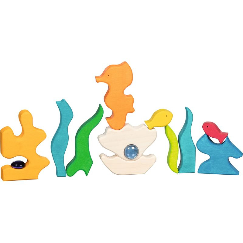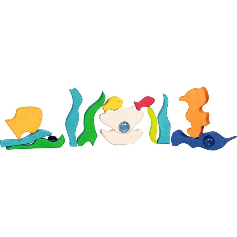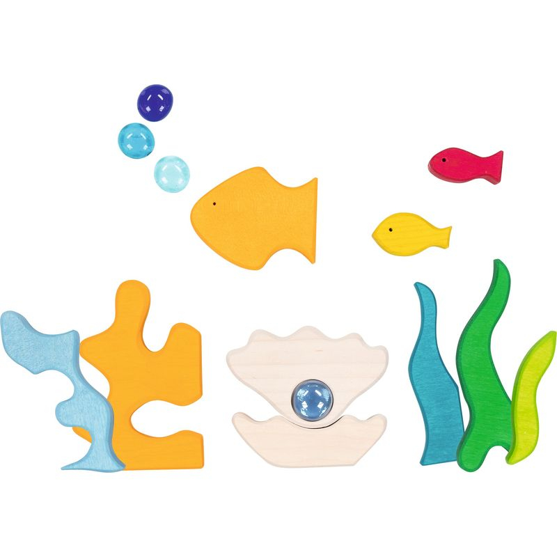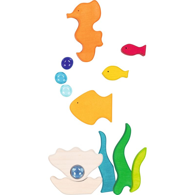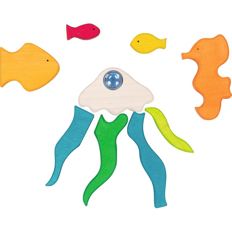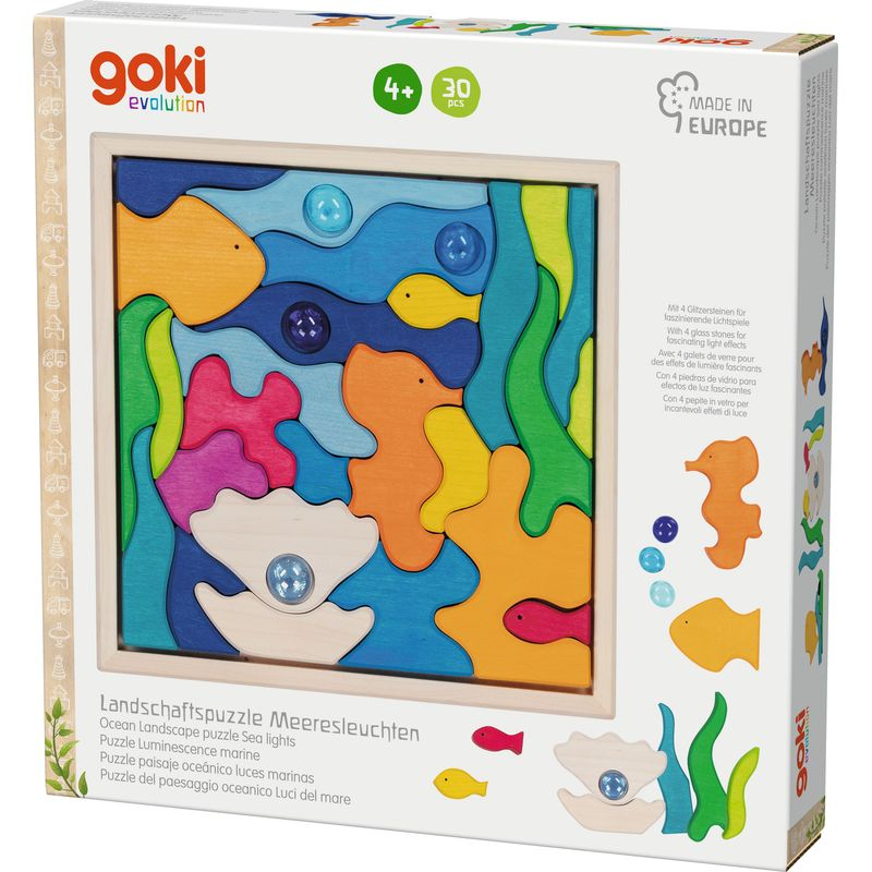 Dřevěná vzdělávací hračka - mozaika Mořský svět. Krásné a duhově zářivé puzzle obsahuje celkem 30 dílků v dřevěném rámečku – vlnky, korály, rybičky, mořského koníka a dokonce i čtyři třpytivé kamínky. Děti mohou skládat podle vlastní fantazie různé obrazce mimo rámeček nebo i uvnitř rámečku. Velkou výzvou je určitě vyskládat dílky zase zpět do původního stavu. Dřevěné dílky jsou příjemné na omak, jsou zářivě barevné a ekologické ošetření nezakrývá přírodní kresbu dřeva. Jednotlivé dílky je možné také využít jako stavební kostky a kombinovat s ostatními kostkami z řady goki evolution. Vyrobeno v Evropě. Vhodné od 3 let.