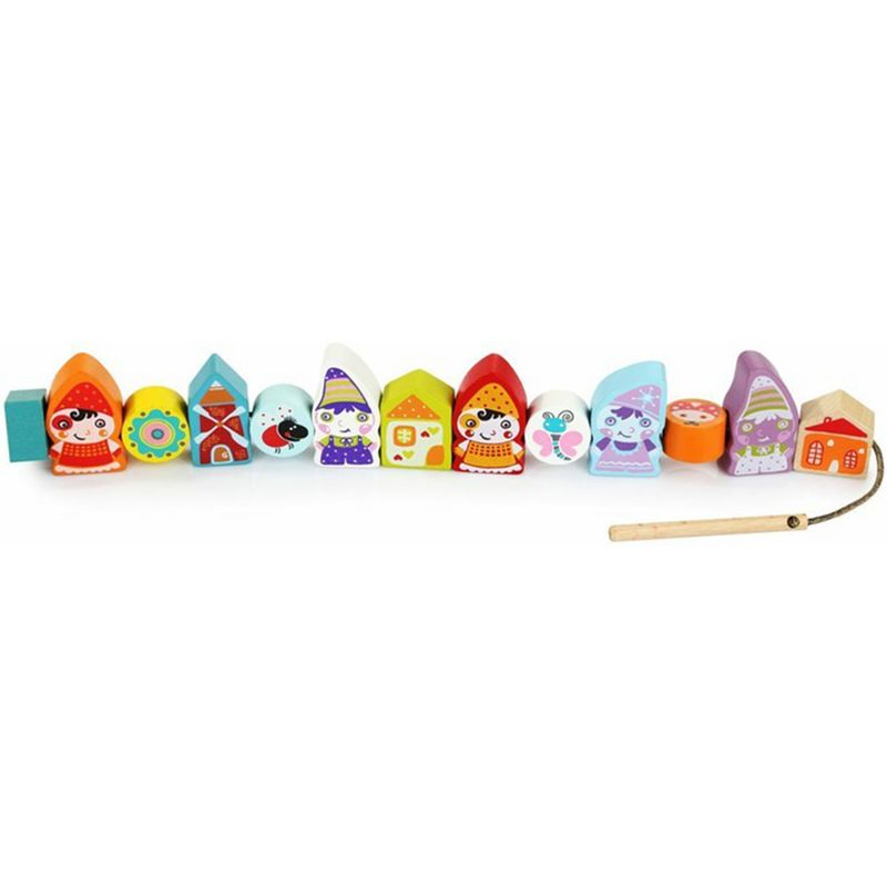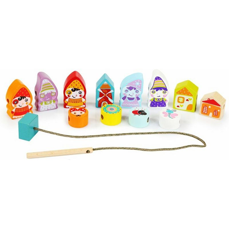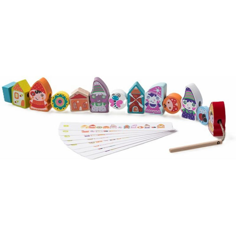 Navlékání dřevěných tvarů na šňůrku  na motivy trpaslíků. Vynikající hračka pro zdokonalování jemné motoriky dětí - vyžaduje koncentraci. Sada nabízí 12 dřevěných navlékacích prvků sprvků s trpaslíky, jejich domečky s různými doplňky, jednu tkaničku s dřevěným kolíčkem na prostrkování na jedné straně a zarážkou na druhé straně a 8 předloh s různě seřazenými tematickými prvky, podle kterých děti jednotlivé dílky navlékají. Zdatnější hráči si pak mohou předlohu jen prohlédnout a zkusit navlékat zpaměti a vytvářet si tak svůj vlatní pohádkový příběh. Tvary lze i postavit - stojí samostatně na hraně. Díky tomu si lze s tvary hrát samostatně jako s hračkou. Podporuje u dětí motorické schopnosti a fantazii.