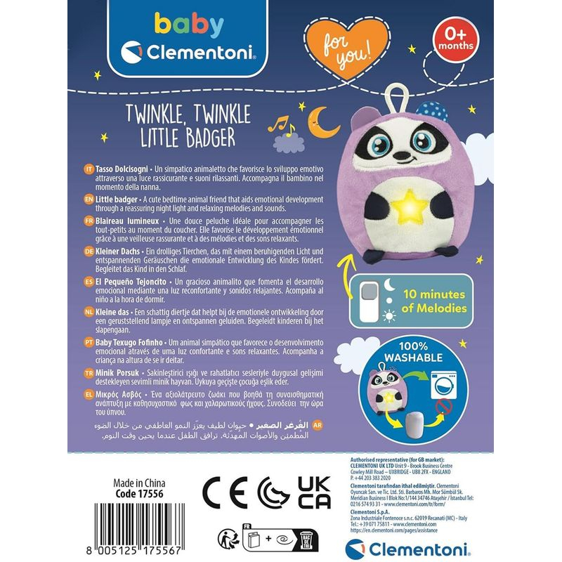 Interaktivní malý jezevec Twinkle je hračka pro děti, která pomáhá při usínaní. Obsahuje uklidňující melodie a bílý šum, speciálně vybrané tak, aby dítěti pomohly s přechodem ke spánku. Teplé světlo vyzařované hračkou vytváří příjemné a uklidňující prostředí, takže je ideální pro novorozence i miminka od 6 měsíců, která se učí spát samostatně. Po vyjmutí elektronického modulu lze prát v pračce. Objevte všechny postavičky řady Twinkle Twinkle od Baby Clementoni: Ovečku, Vlka, Lišku nebo Jezevce.