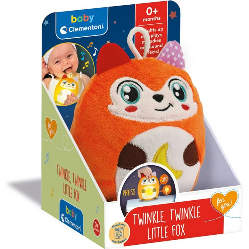 Interaktivní malá Liška Twinkl je, hračka pro děti která pomáhá při usínaní. Obsahuje uklidňující melodie a bílý šum, speciálně vybrané tak, aby dítěti pomohly s přechodem ke spánku. Teplé světlo vyzařované hračkou vytváří příjemné a uklidňující prostředí, takže je ideální pro novorozence i miminka od 6 měsíců, která se učí spát samostatně. Po vyjmutí elektronického modulu lze prát v pračce. Objevte všechny postavičky řady Twinkle Twinkle od Baby Clementoni: Ovečku, Vlka, Lišku nebo Jezevce.