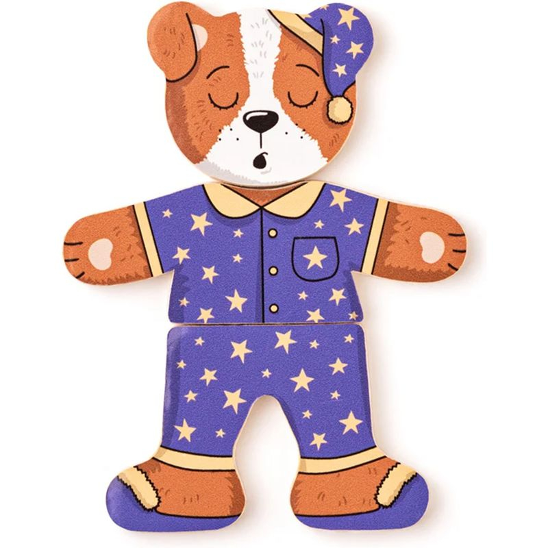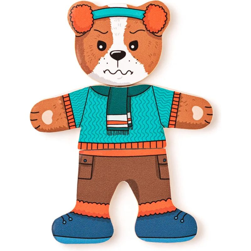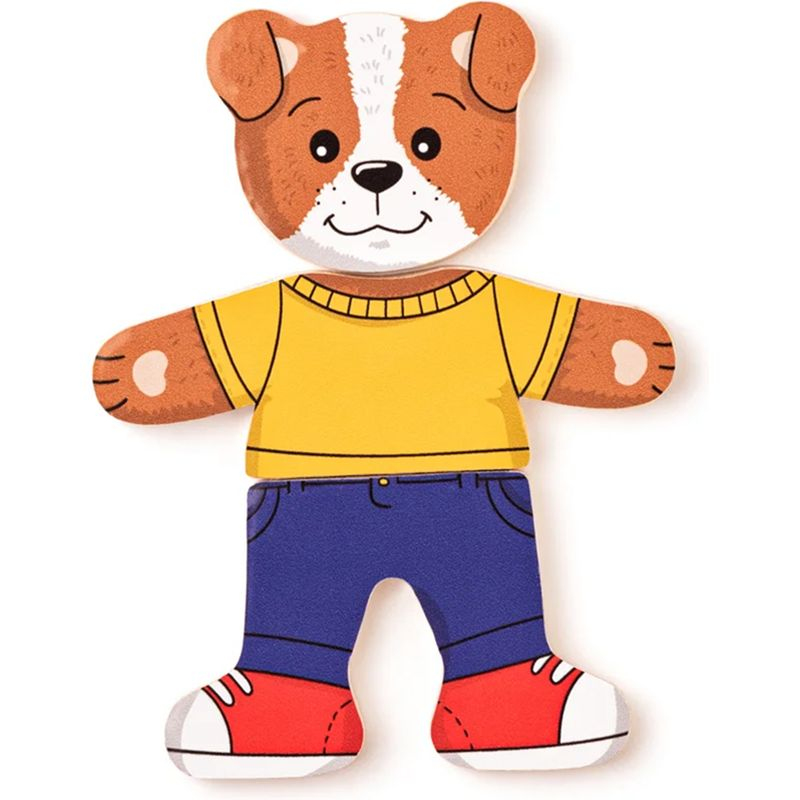 Dřevěné oblékání pejska. Jinou formou hry s puzzlem jsou tzv. šatní skříně, kde děti mají možnost si dle vlastní fantazie oblékat a měnit postavičku pejska. Rozvijí schopnost logického myšlení a vývoj fantazie. Set obsahuje 18 dílů.