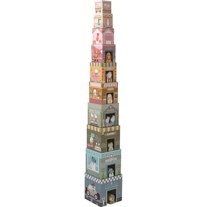 Skládání je zábava! Tato dřevěná věž v jemných pastelových barvách se skládá z 10 kostek různých velikostí, které děti mohou stavět na sebe jako vysoký mrakodrap nebo rozložit vedle sebe jako městečko. Každá kostka představuje jinou městskou budovu. Najdete zde nemocnici, školu, knihkupectví, květinářství i supermarket. Na stranách kostek jsou detailní ilustrace budov a 6 kostek má také okýnko, kde si děti mohou schovat dřevěné figurky, roztomilé zvířecí postavičky, které představují různá povolání. Víte, do kterého domečku patří slon, pejsek nebo lev?  Díky skládání, třídění a hraní si děti rozvíjejí motoriku, logiku, kreativitu i porozumění tvarům, barvám a rolím ve městě. Věž lze snadno skládat a rozkládat a díky tomu je ideální nejen na doma, ale i na cesty. Poslouží také dobře jako kulisy, rozvíjí fantazii dětí a povzbuzuje k představivé hře.  Ať už jako věž nebo kulisy ke hře, hračka přináší nekonečné možnosti zábavy!