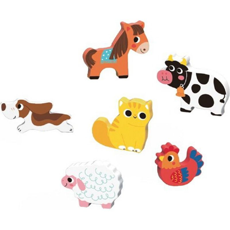 Těchto šest kostek s okýnkem slouží nejenom jako skládací věž, ale i jako domečky pro příslušná zvířátka - každý kamarád z farmy má tedy své bezpečné místečko. Aby děti věděli, jak správně na sebe domečky pokládat, každý je opatřen svým jedinečným číslem. Skládání a třídění pomáhá rozvinout porozumění barvám a tvarům a procvičuje motoriku s koordinací. Sada podněcuje k nápadité hře. Dává dětem možnost se naučit jak hospodářská zvířátka žijí  a jak se o ně správně postarat.