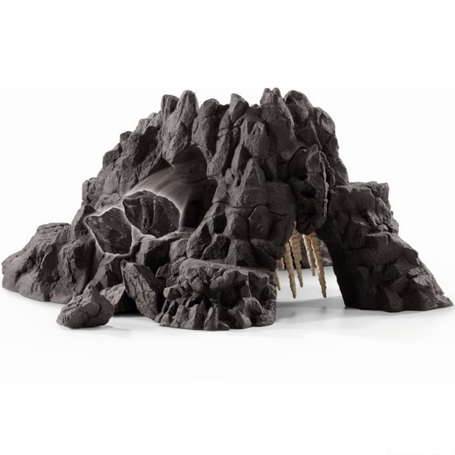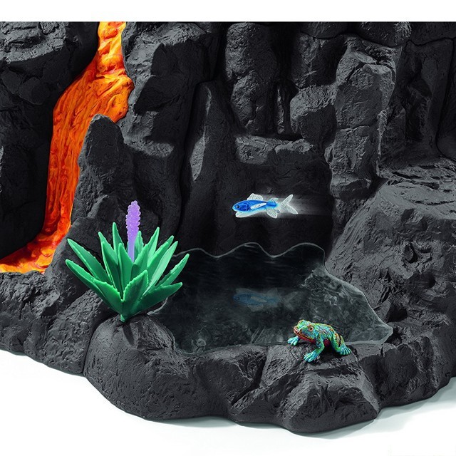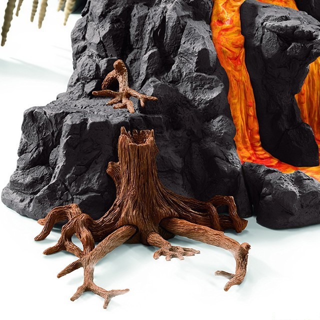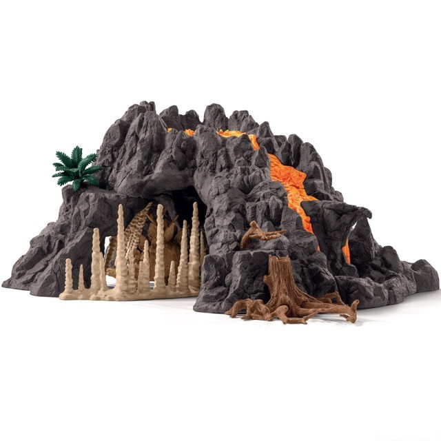V sestaveném stavu dosahuje sopka výšky 26cm a je tak optimálně vhodná pro hraní s velkými Schleich dinosaury. Stisknutím záhadné lebky se uvolní krápníky a zabrání vstupu do jeskyně. Vznikne tak chladné, dinosauří vězení. Dále je zde odnímatelná vodní plocha s tajným úkrytem pro malá vodní zvířata. Stisknutím velkého kamene se spouští exploze sopky a děti si mohou představit jak horká láva teče do údolí, kde hrozí záhuba rostlin a živočichů. Jsou zde také sestavitelné rostliny a mnoho míst k zasazení rostlin. Zábavným puzzle z 5 skalních balvanů vznikne fosilie. Důležité jsou pasti na dinosaury. Osm dílů kostry Stegosaurus mohou děti sestavit a hrát si s pohyblivými díly těla.