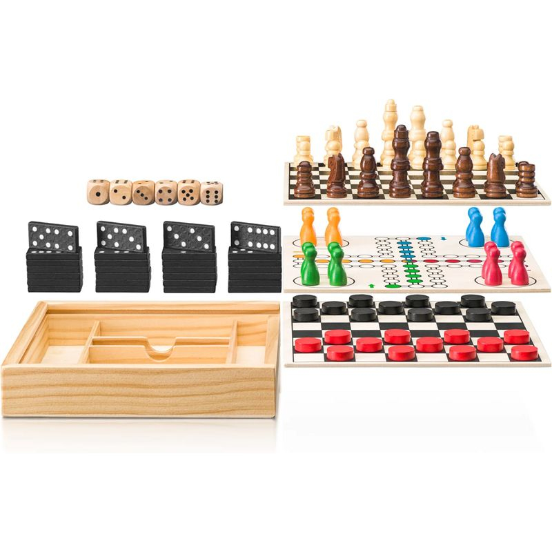 Vkusný soubor stolních her v dřevěném boxu, jehož víko tvoří oboustranná hrací deska pro jednotlivé společenské hry (šachy, dáma, člověče, nezlob se). Ke každé společenské hře najdete i příslušné figurky a hrací kostky. Magnetické provedení tohoto setu rozšiřuje jeho využitelnost i pro dlouhé cesty autem, vlakem či letadlem. Součástí setu jsou i hrací kameny domina a sada hracích kostek.