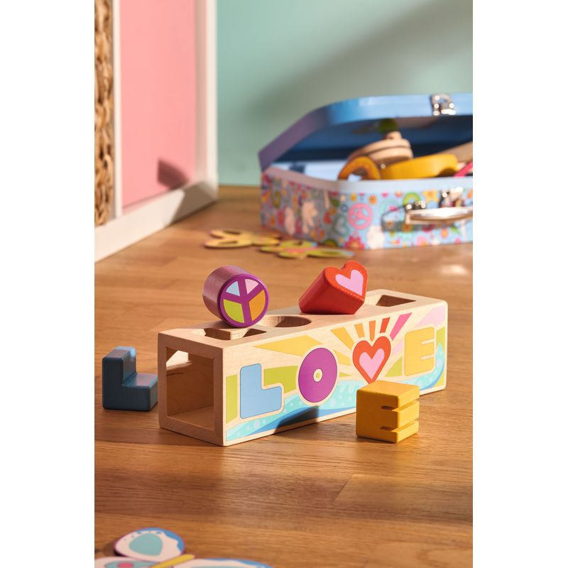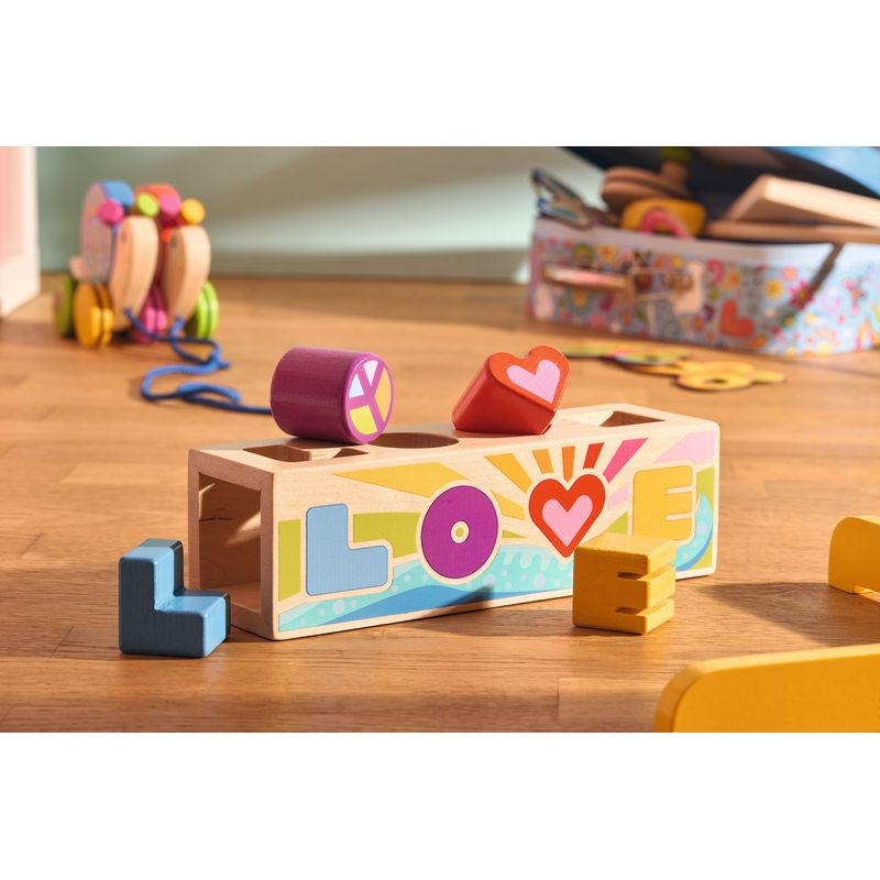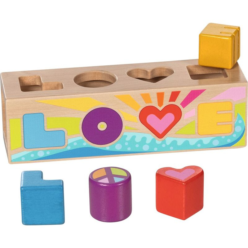 Dřevěná krabička s geometrickými tvary, která slouží jako vhazovačka, 4 kostky, Love.