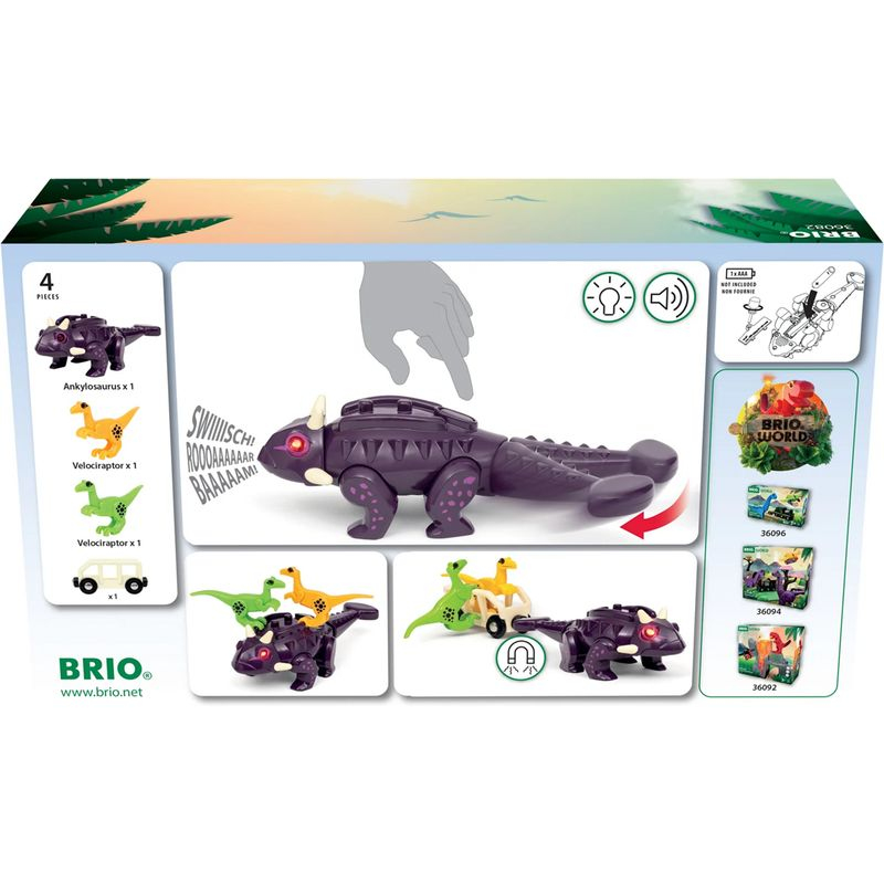 Mohutný dinosaurus, jenž dokonale zapadá do dřevěných vláčkodrah BRIO, ožívá díky červeným svítícím očím a řevu aktivovanému pohybem. Ankylosaurus má pružinový ocas připravený k švihu a dítě jím může povalit dvě barevné figurky velociraptorů, které jsou součástí sady. Magnet ukrytý v ocasu umožňuje tahat vagónky, podobně jako vláčky BRIO. Hračka je součástí řady BRIO World – Svět dinosaurů, kterou musí mít všechny děti milující dinosaury a vláčky.