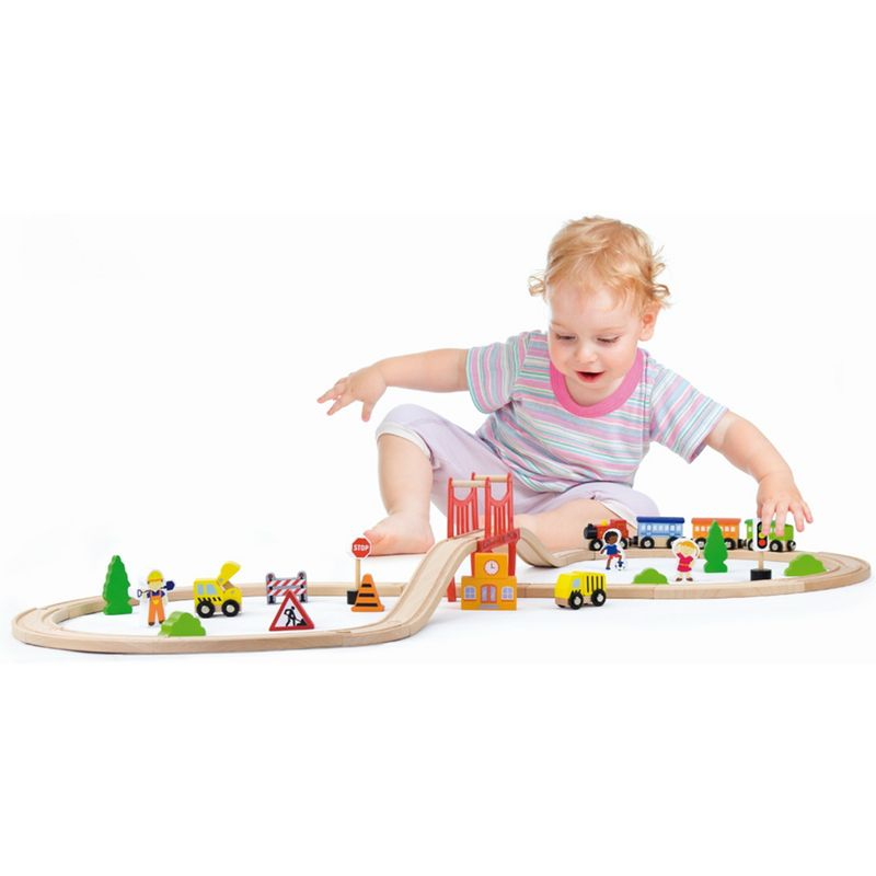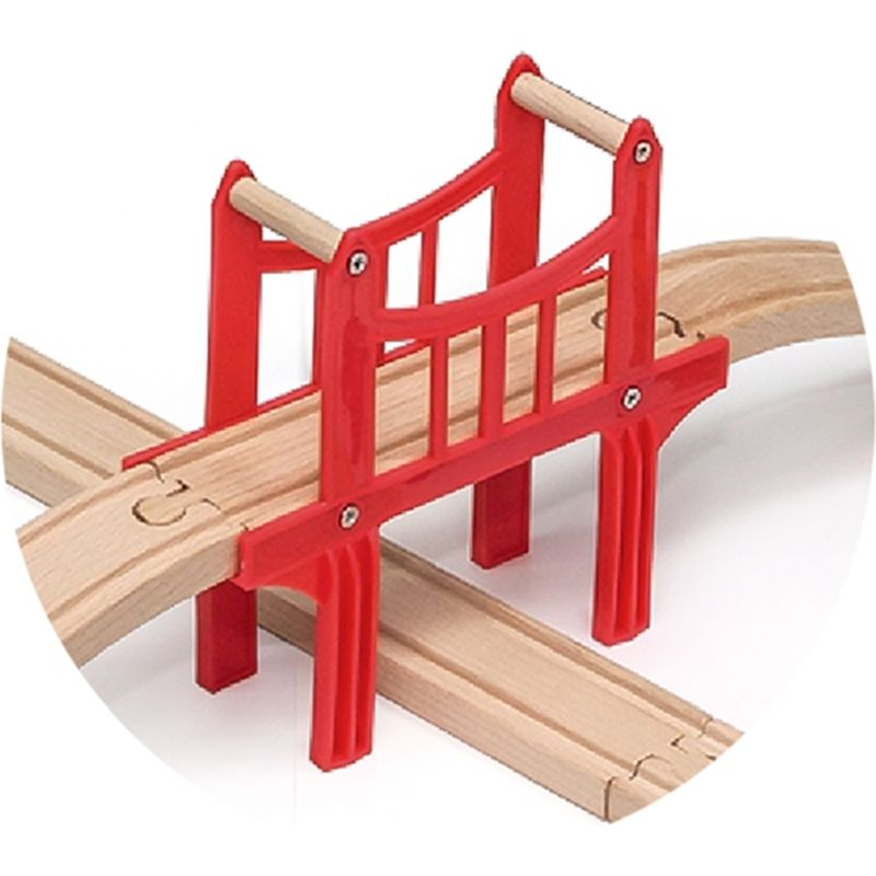Dřevěná vláčkodráha s mostem a vláčkem a příslušenstvím.