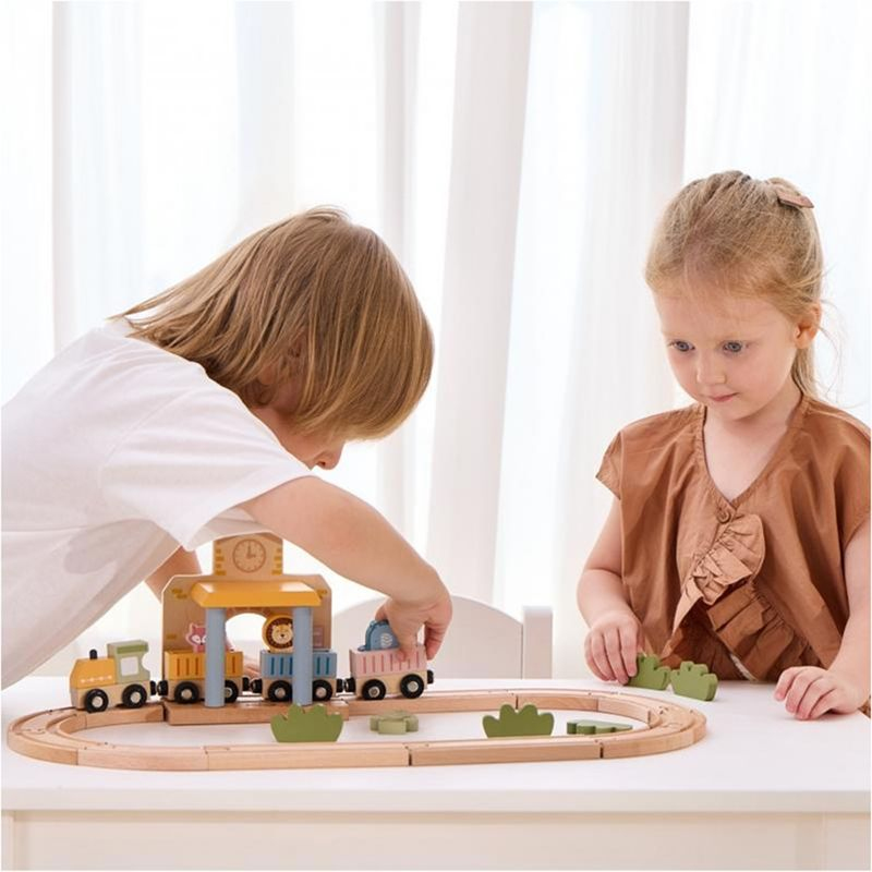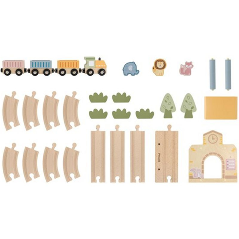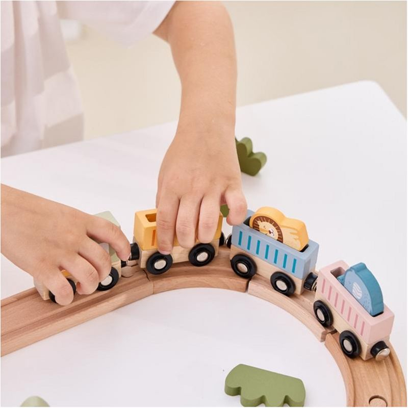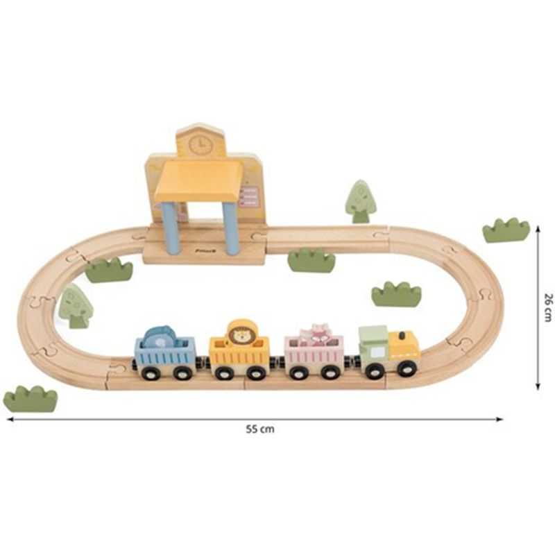 Dřevěná vláčkodráha pro začínající strojvůdce. Jednoduchý set který dítě seznámí s kouzlem dřevěných vláčkodráh. Set zahrnuje stromy a vláčekse zvířátky, které se společně dětmi zapojí do zábavné hry. Vlaková sada obsahuje celkem 30 dílků. Napájení na 2 knoflíkové baterie. Rozměry rozložené vláčkodráhy 53x25,4x15cm. Baleno v krabici. Rozměry balení 25,5x16,5x5,5cm.