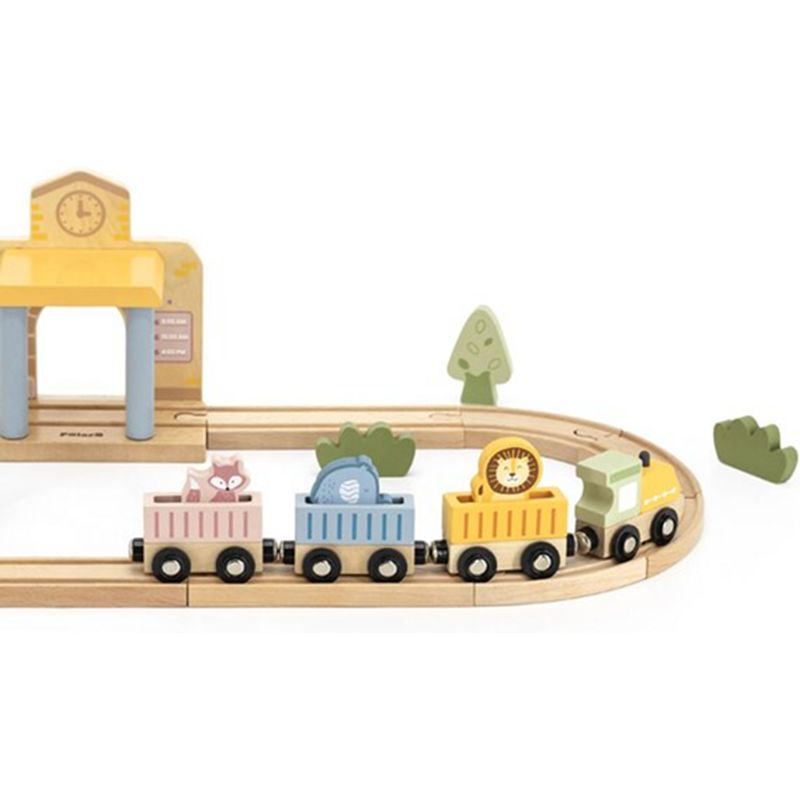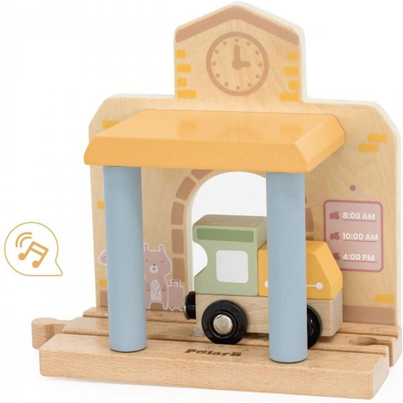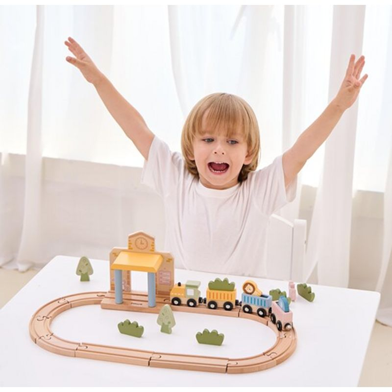 Dřevěná vláčkodráha, ovál startovací set. Při průjezdu zastávkou se zvukem.