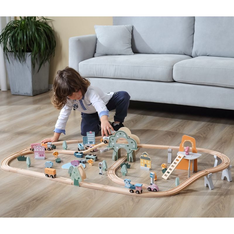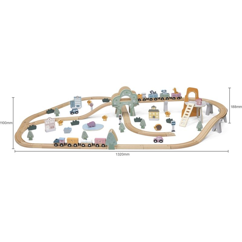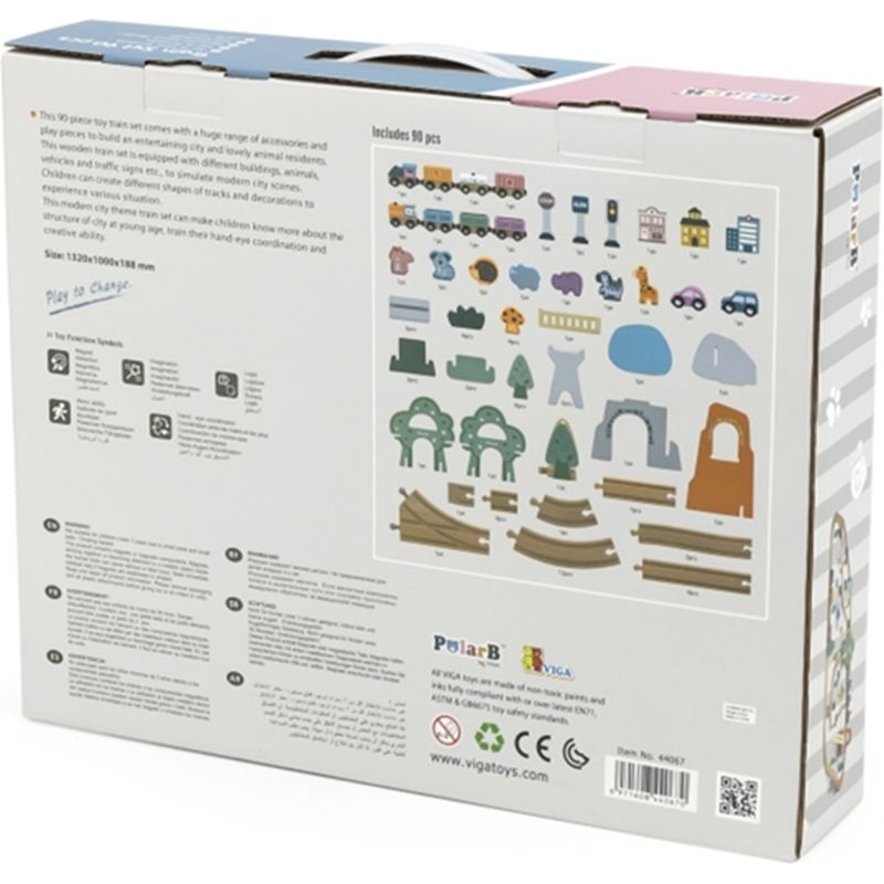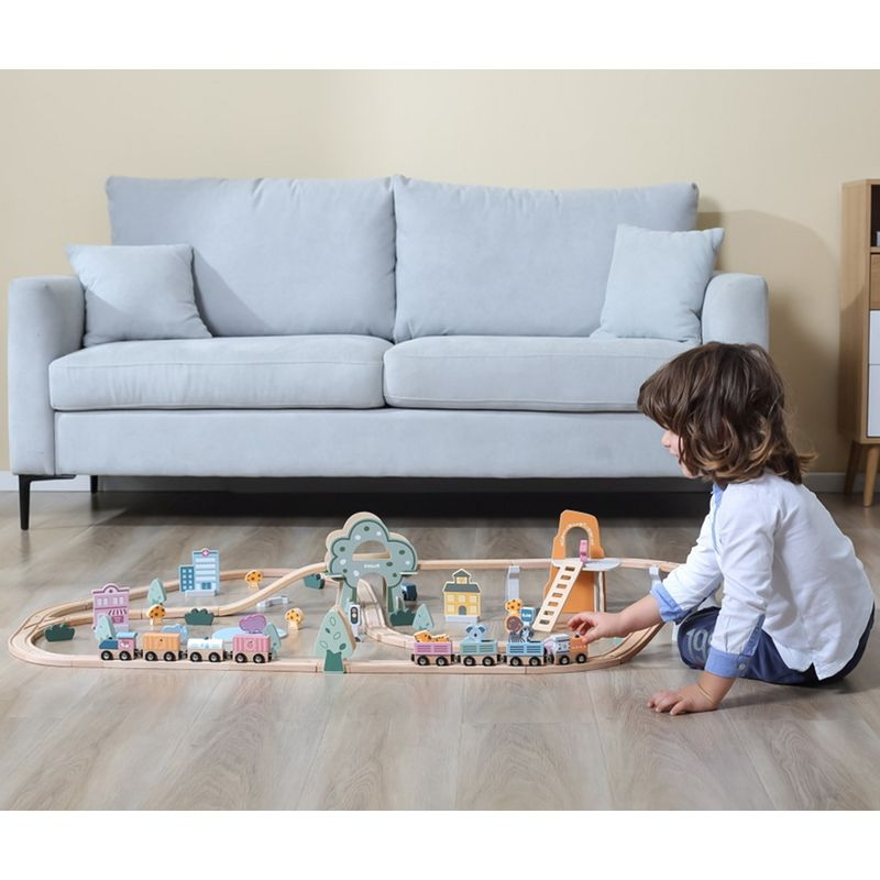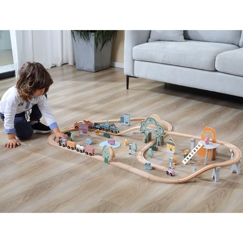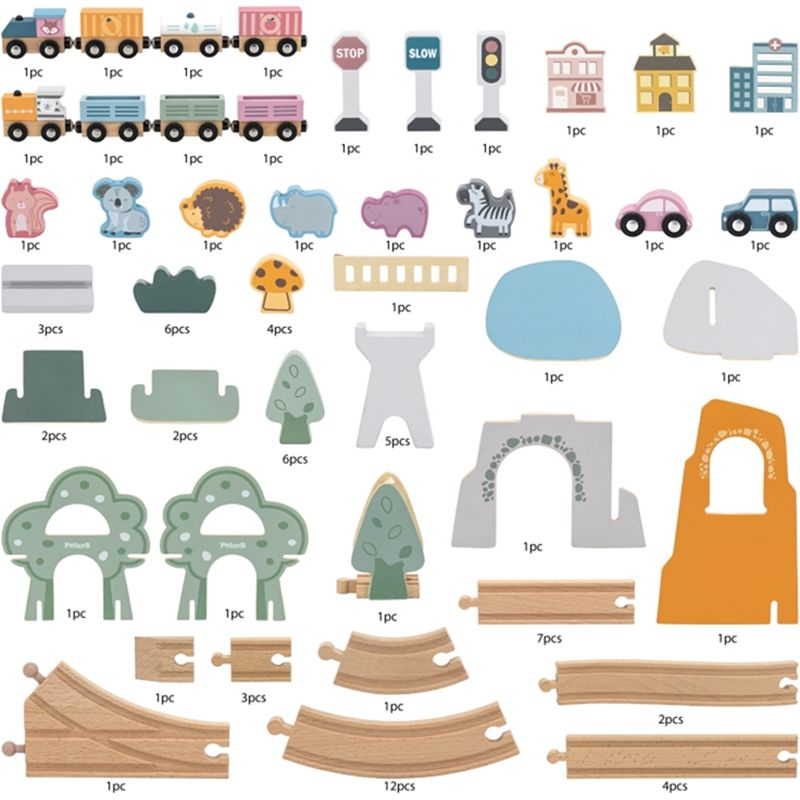 Dráhu lze postavit pokaždé jinak a možno kombinovat i s jinými stavebnicemi na trhu. Zapojte svou představivost a vydejte se s vláčkem na nekonečně dlouhé dobrodružné výlety kamkoli Vás Vaše fantazie zavede.Tato 90dílná sada vláčků obsahuje širokou škálu doplňků a herních figurek k vybudování zábavného města s krásnými zvířecími obyvateli. Dřevěná hračka je vybavena různými budovami, zvířaty, vozidly a dopravními značkami, aby simulovala moderní městské scény. Děti mohou vytvářet různé tvary drah a dekorací, aby si vyzkoušely různé situace. Díky této moderní vlakové soupravě s tématikou města mohou děti vědět více o struktuře města v mladém věku, trénovat jejich koordinaci ruka-oko a kreativní schopnosti.