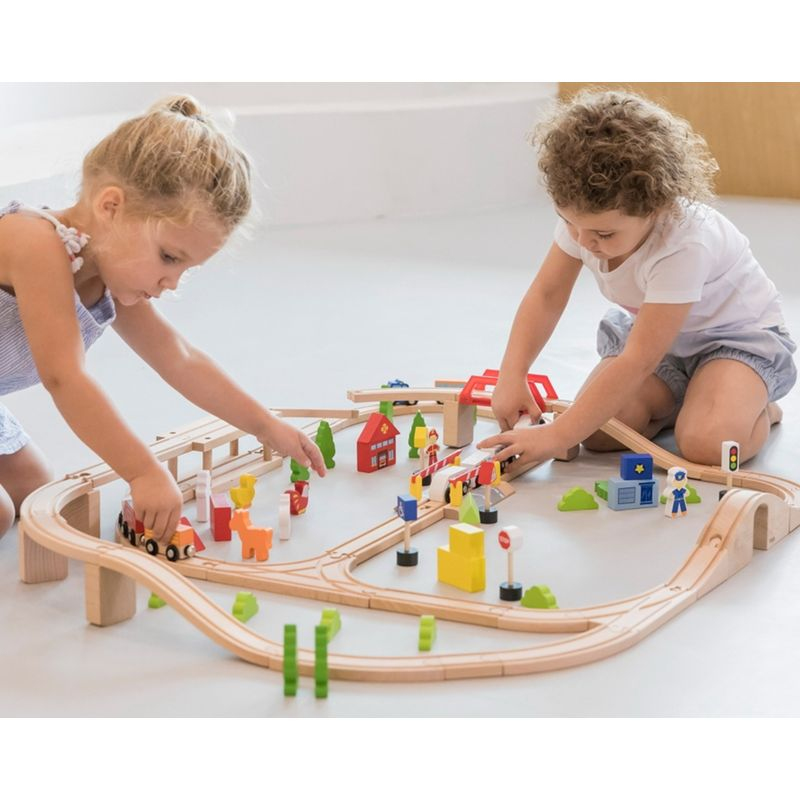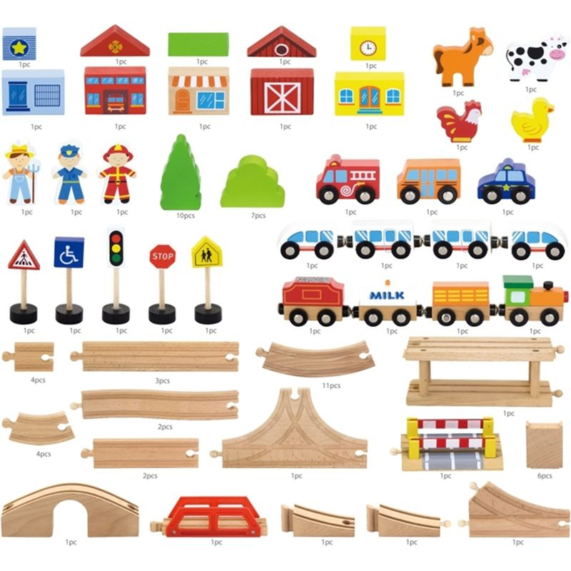 Dráhu lze postavit pokaždé jinak a možno kombinovat i s jinými stavebnicemi na trhu. Zapojte svou představivost a vydejte se s vláčkem na nekonečně dlouhé dobrodružné výlety kamkoli Vás Vaše fantazie zavede. Dřevěná vláčkodráha obsahuje celkem 90 kusů. Balení obsahuje například koleje, závory, 2 vlaky, auta, postavičky, zvířátka a další doplňky. Rozvíjí u dítěte motoriku a představivost.