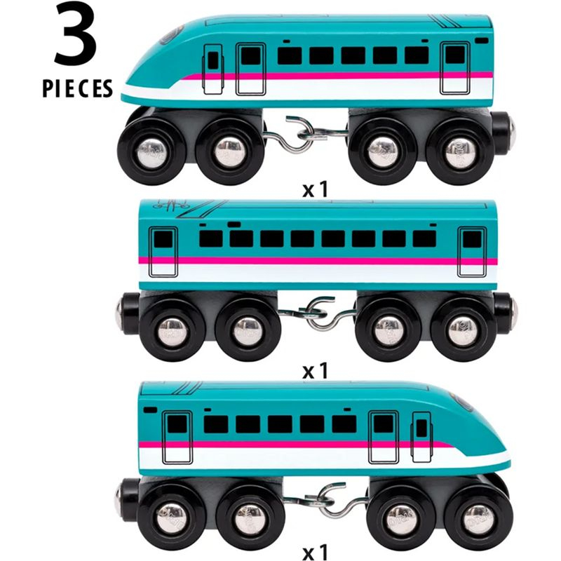 Dřevěný vláček Šinkansen jako doplněk k vláčkodráze. Je to rychlovlak, se kterým se dá ušetřit hodně času. Tento dřevěný vysokorychlostní vlak má dvě lokomotivy a jeden osobní vagón v zářivých barvách, přičemž každý má osm kol na dvojitých podvozcích. Hajabusa, která dosahuje maximální rychlosti 320 km/h, je nejrychlejším rychlovlakem v celém Japonsku. Sada obsahuje 3 díly: 2x lokomotiva, 1x osobní vagón.