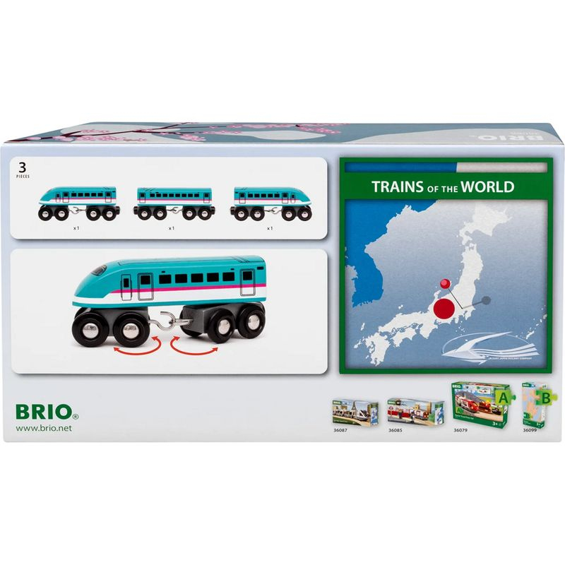 Dřevěný vláček Schinkansen Brio jako doplněk k vláčkodráze.