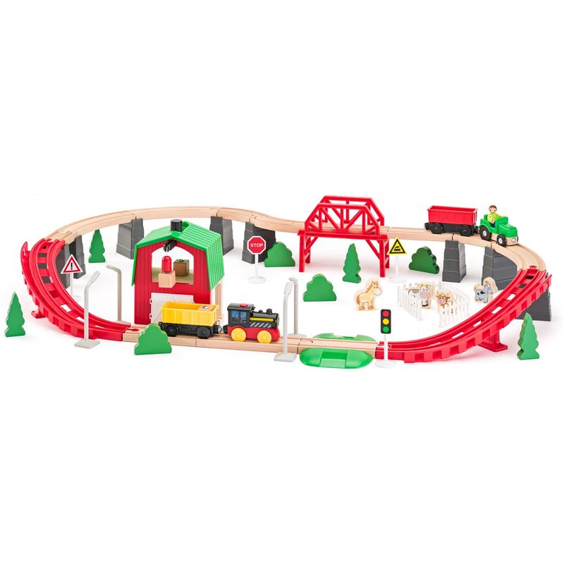 Vláčkodráha s plastovými prvky navozuje atmosféru života na farmě. Naviják s magnetem umístěný na budově farmy nakládá balíky do přistaveného vagónku, prostor pro zvířátka je vyhrazen v bílé ohrádce. Pomocí mostových bloků je možnost vést kolejisko o několik úrovní výše. Je kompatibilní s ostatními vláčkodráhami nabízenými na našem trhu.