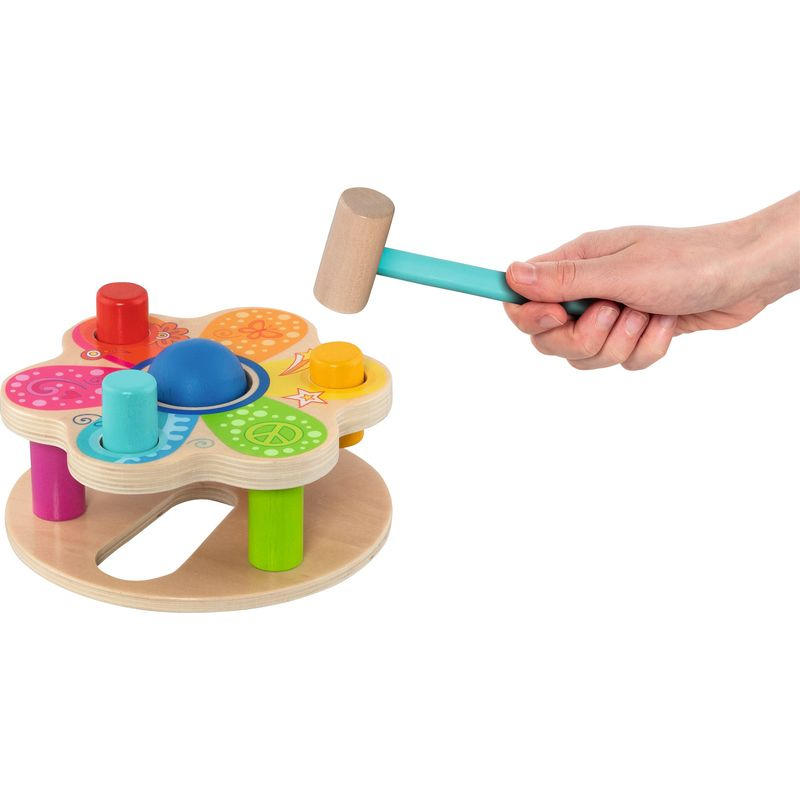 Dřevěná zatloukačka s kolíky a kladívkem, ve tvaru květiny.